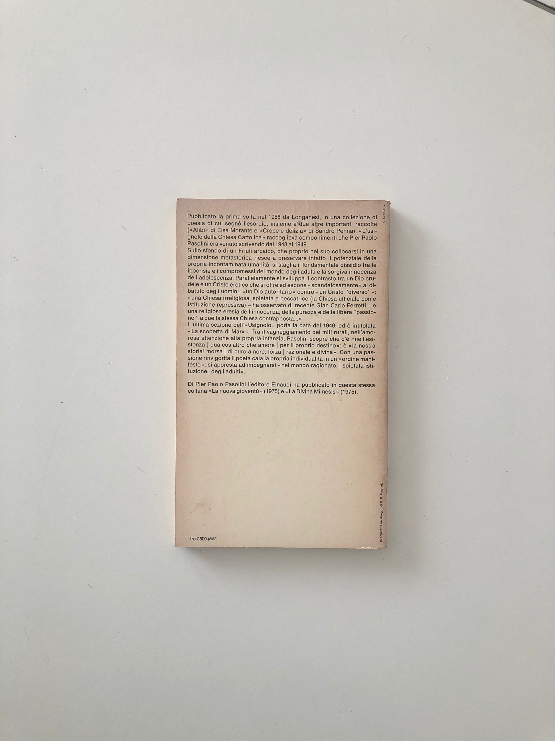 L’usignolo della Chiesa Cattolica è una delle raccolte poetiche più intense e sofferte di Pier Paolo Pasolini, scritta tra il 1943 e il 1949. In questi versi, il giovane Pasolini esplora con una sensibilità bruciante il rapporto conflittuale tra sacro e profano, tra l'innocenza del mondo contadino friulano e il peso della dottrina cattolica. È un diario lirico di una scoperta di sé e del mondo, dove la religione diventa uno specchio per indagare il corpo, il desiderio e la solitudine. Questa edizione Einaudi, con la sua caratteristica estetica rigorosa, è un pezzo imprescindibile per ogni studioso e appassionato della voce più profetica del nostro Novecento.